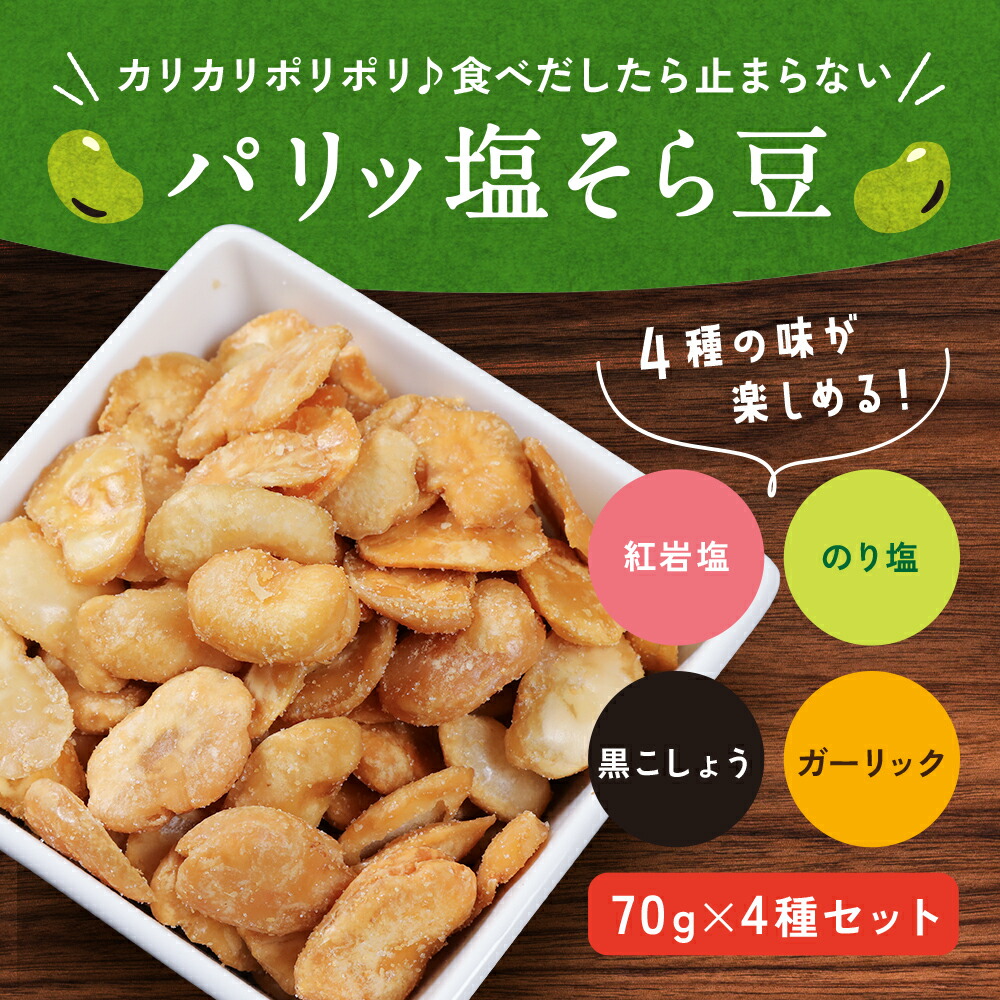 やみつき塩そら豆4種セットの商品ページ。紅岩塩・のり塩・黒こしょう・ガーリックの個性が伝わるカラフルなデザインに仕上げました。