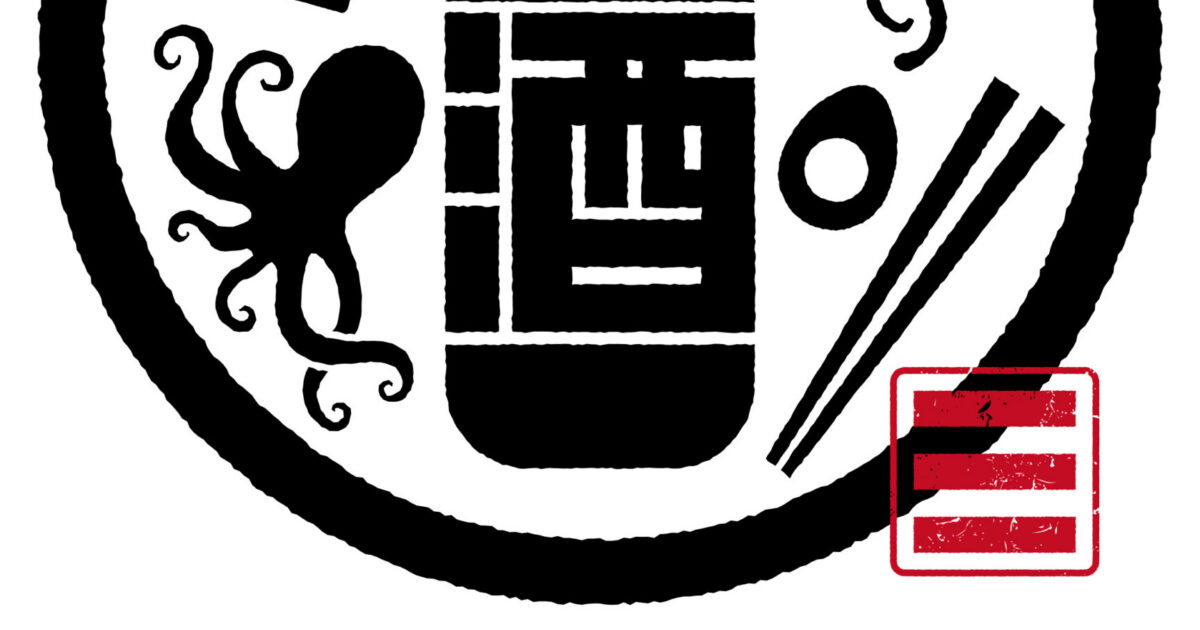 円形の構図の中に、「酒」の文字が入った徳利を中心に、お猪口・イカ・タコ・箸といったモチーフを版画調のタッチで凝縮。日本の食文化の豊かさと、酒の肴を楽しむ粋な世界観を一つのマークに集約しています。右下に添えた赤い三本線の印は「ミツワ」の名を判子のように表現し、和のアクセントと信頼感を演出しました。