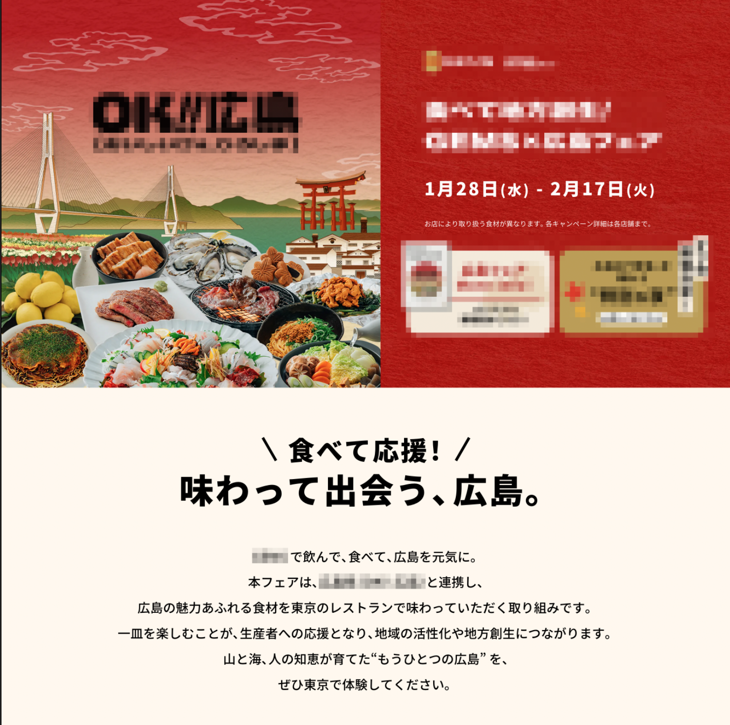 都内を中心に飲食特化型の商業施設を複数展開するクライアント様の、フードフェアポータルサイトを構築しました。「食べて地方再生」をコンセプトに、各地方の食材や料理を施設内の飲食店で楽しめるフードフェアの情報を発信するサイトです。
