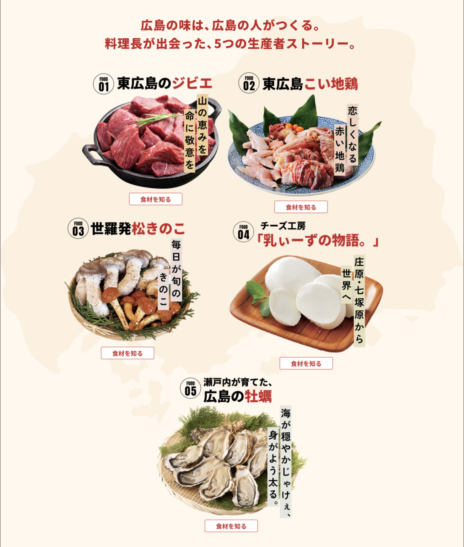長崎県を皮切りに京都・山形・長野・高知・愛媛・熊本・鹿児島・広島と、半年ごとに新たな地方とコラボレーションするフェアを開催。各回のフェア情報やメニュー紹介、参加店舗一覧などを掲載しています。