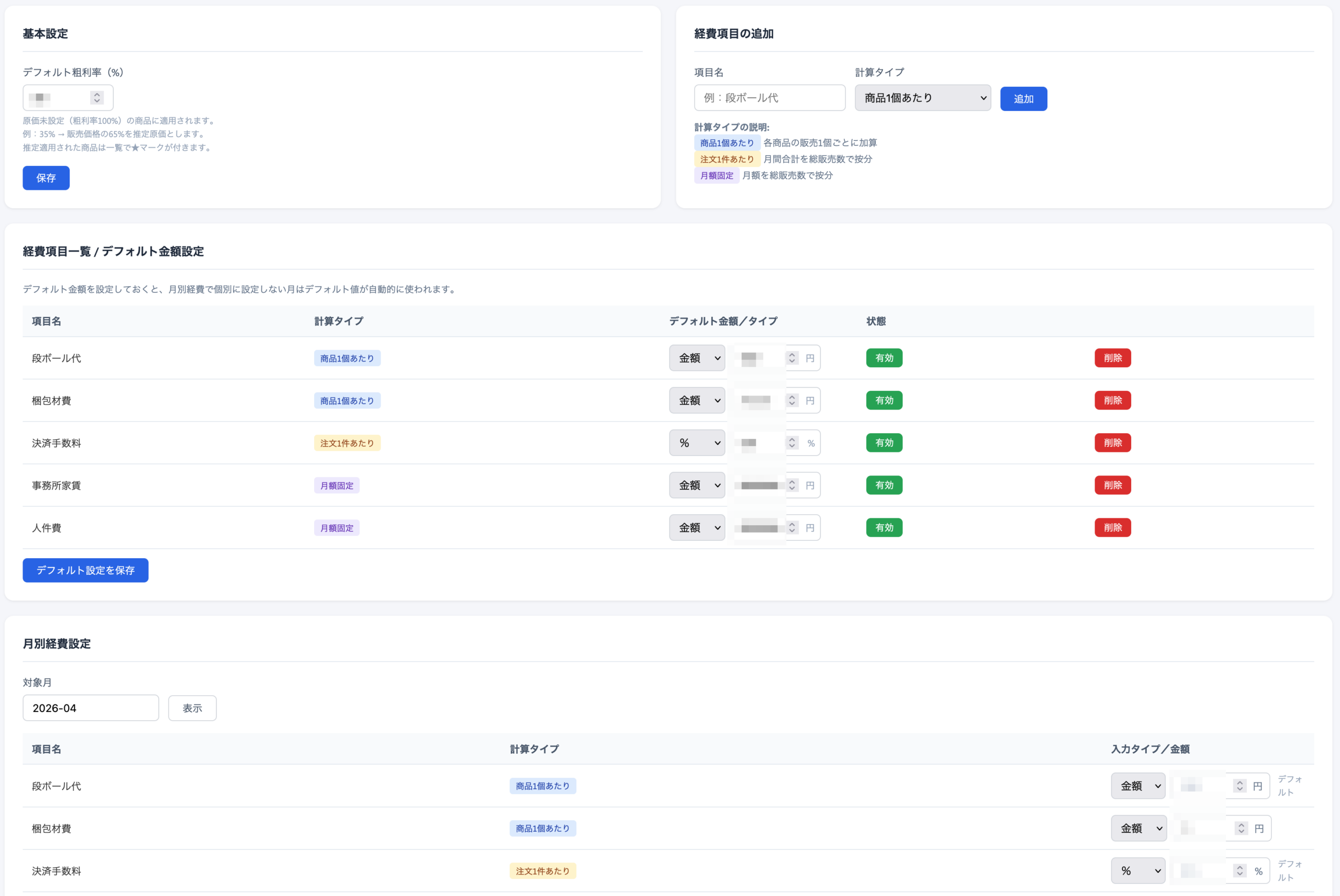 段ボール代・梱包材費・手数料など、経費項目を「件あたり」「個あたり」「月額固定」の3タイプで柔軟に設定可能。月ごとの金額変更にも対応し、変動費・固定費を分離した精度の高い損益計算を実現しています。