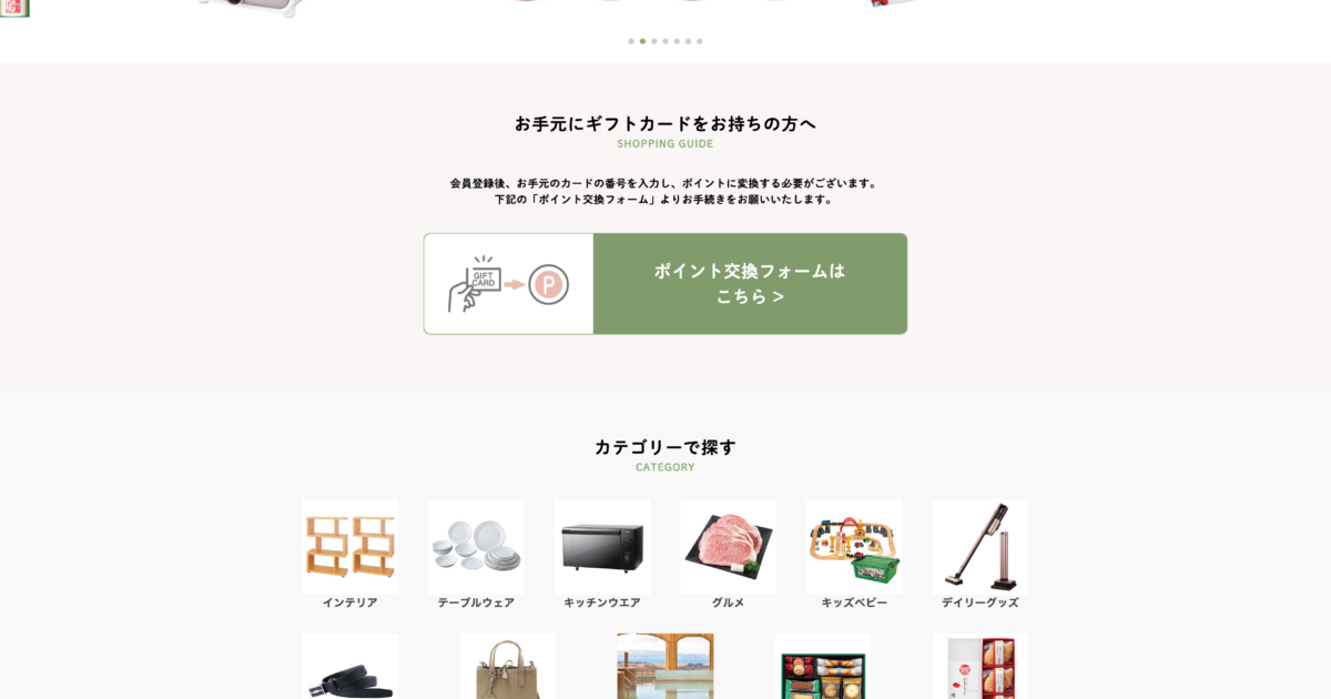 サイトの中核となる機能です。ユーザーがギフトカードに記載された3分割のコードとパスワードを入力すると、紐づいたポイントが会員アカウントに加算されます。コードは専用のDBテーブルで管理され、使用期限チェック・使用済みフラグの更新・交換履歴の記録まで一連の処理を実装しています。